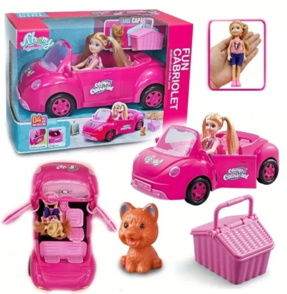 Pozwól dziecku wyruszyć w drogę i odkrywać przygody z opowiadaniem historii z tą uroczą mini laleczką, jej psem i uroczym, różowym kabrioletem!
