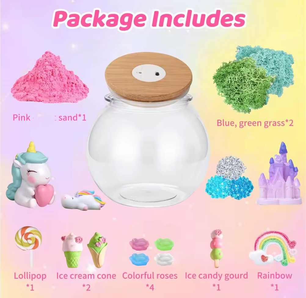 W środku znajdziesz wszystko, czego potrzeba, by samodzielnie zbudować piękną lampkę nocną w słoiku – z piaskiem, mchem, figurkami i mieniącymi się kryształkami.