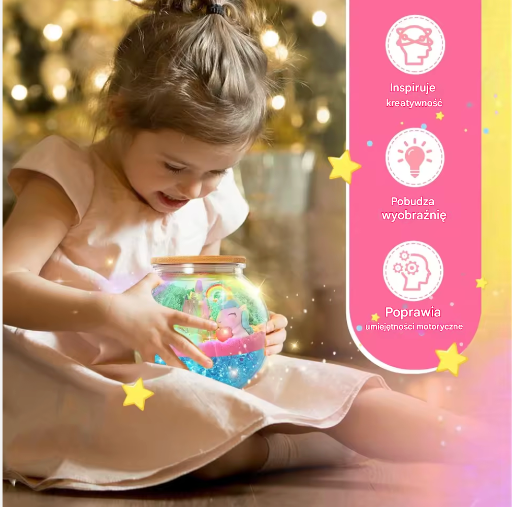 Zestaw „Jednorożcowy Ogród Światła” to niezwykła zabawka kreatywna, dzięki której Twoje dziecko stworzy świecący mini-świat pełen kolorów, tęczy i fantazji.