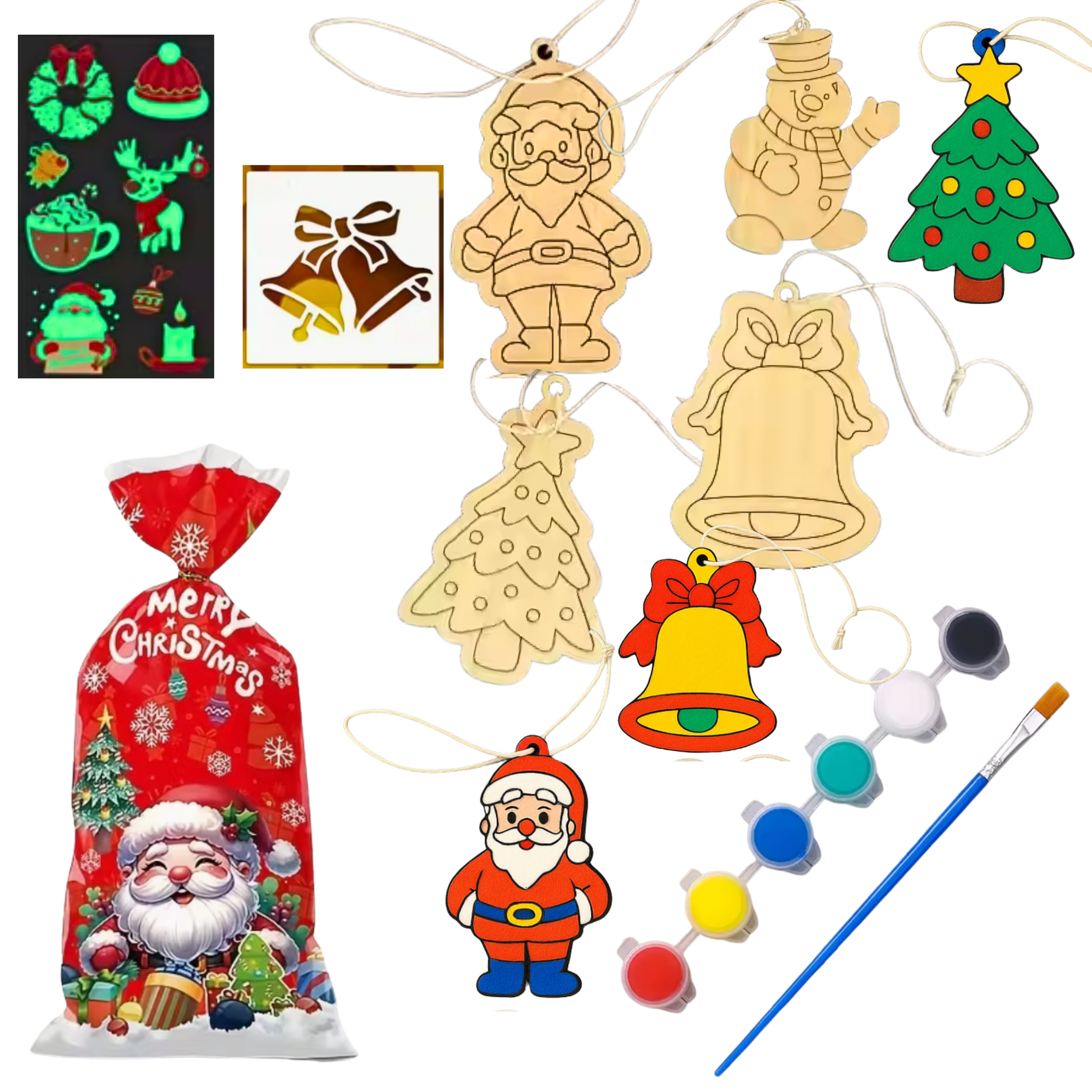 ⭕ Zestaw kreatywny prezentowy świąteczny na mikołajki do malowania farby, szablony, świecące tatuaże i torebka prezentowa.